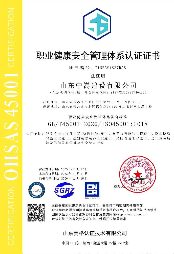 • 山東中嵩建設(shè)有限公司-OHSMS證書中文
